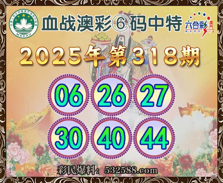 318期: 血战澳彩 💄⑥码中特💄【06.26.27.30.40.44】开:06准